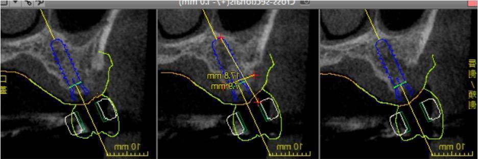 インプラントの埋入深さ、ハウスフィールドユニット、インプラントの形状、手術ガイドの使用の有無、隣在歯との距離、神経との距離等、さまざまな事を考えます。