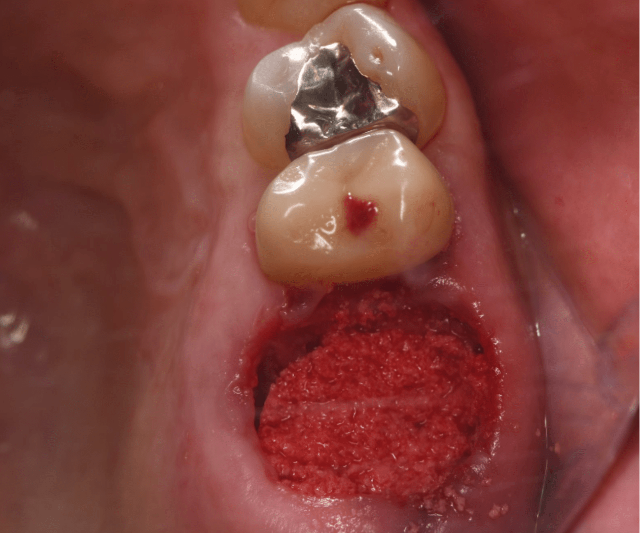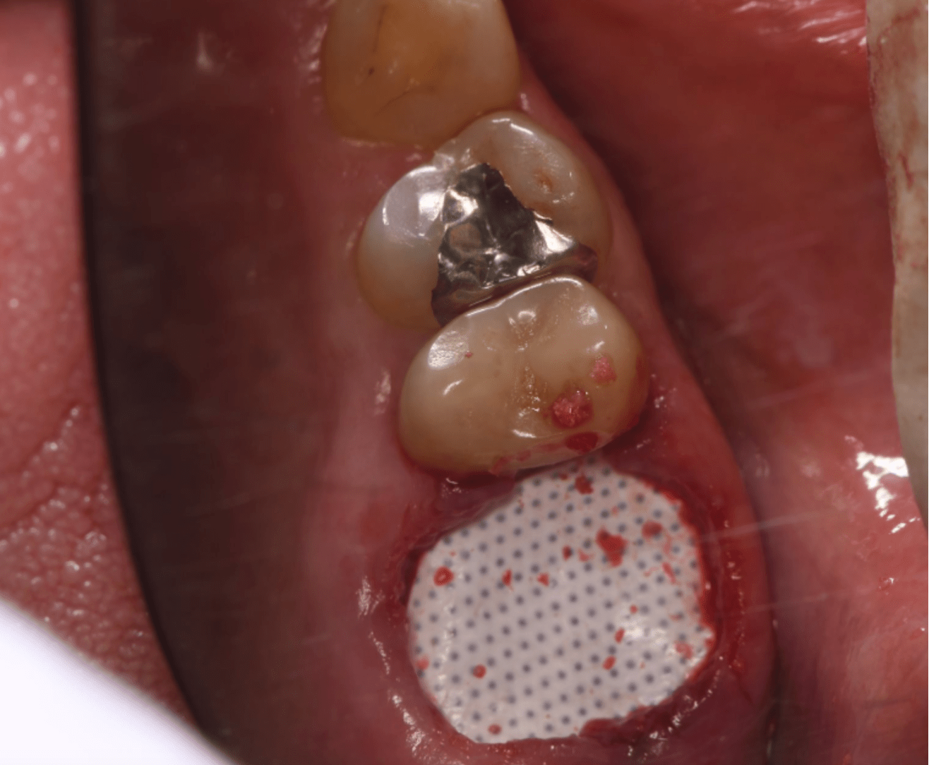 私は細菌を通さない膜で、抜歯窩に入れた骨を守っておき、約1ヶ月後に膜を外します。