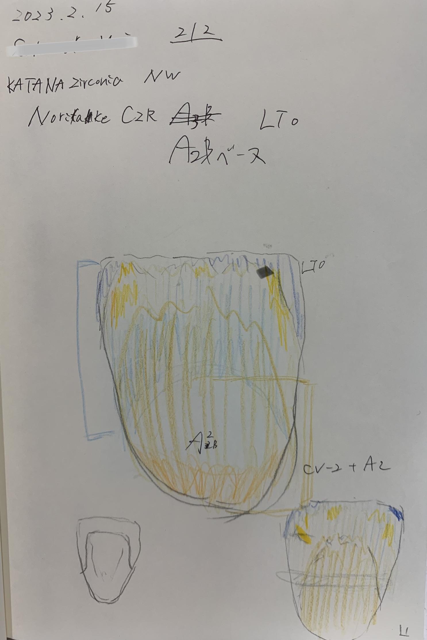 私がしている歯のお絵描きと言うのは実際患者様のお口の中を見て歯の根本から先端や裏側の隅から隅まで観察しスケッチする。その時この色や透明な部分や着色はどう表現したら良いかスケッチと共に設計をするわけです。そしてそれを元に写真と照らし合わせて作製していく。