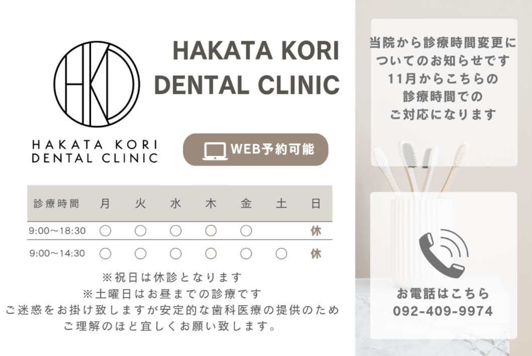 博多こおり歯科は、11月より診療時間を変更いたします。