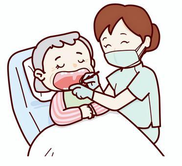 実際の現場では、歯みがきが難しい方や、義歯の管理が不十分な方も多く見受けられます。そういった場合には、専門的口腔ケア(歯石除去・粘膜清掃・義歯清掃)に加え、ご本人の状態に合わせた清掃方法の提案や、ご家族・介護者の方への具体的なケア指導も行っています。